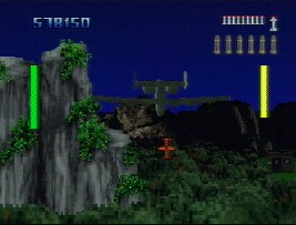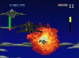 Gameplay. Now, this is where the fun comes in. Although this game is a little drab graphically, the fun factor is great. This game brings back the old Iron Soldier feeling of destruction. You've got seven planes (one hidden one that I can't find) to choose from, and they each have different control, speed, and weapon storage. You've got your machine gun, Cluster bombs(wipes everything out in a horizontal spread), Napalm(a fireball that burns in a straight line for quite a long time), and the Slammers which are for the main targets. Your manuevers are basic. Pull off your 360 to avoid the enemies. Use the After-burner to haul some hanes and track somebody down, or use the air-brakes to fake somebody out. You have the traditional behind plane view, or the cockpit view, which is nice if there is so much smoke pouring out of the back of your plane that you can't see a thing. There are land and airstrikes, some in daylight, others at night. Fly the ultra jammed packed cities of Europe, narrowly escaping a skyscraper. I like to turn on the After-burners with the Tomcat and feel the wind going through my hair(well, almost). This brings me to my next point. Speed. This game gives you a GREAT deal of speed. Of course this depends on the plane that you have. This game has TONS of LARGE sprites that scale by at blazing speeds, and the frame-rate doesn't seem to suffer at all. I guess that sprite scaling is one of the Jag's main strengths. You won't believe the speed of the Tomcat!