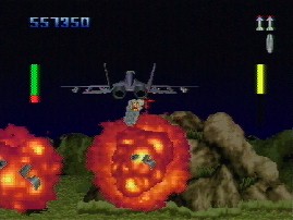 There are mission objectives, though not as complex as Iron Soldier's, it still something to accomplish. Every different plane isn't a whole new experience, but the difference in control is significant enough to keep the action varied. Every cinema is slightly changed for each plane, so it's nice to see that smaller things like this weren't looked over. Frame rate is constantly high, and enemy helicopters, tanks, trucks, planes, and so forth are well detailed, though they look like card board cut-outs themselves. The transition from outside view to in the cockpit looks cheesy but it's decent.