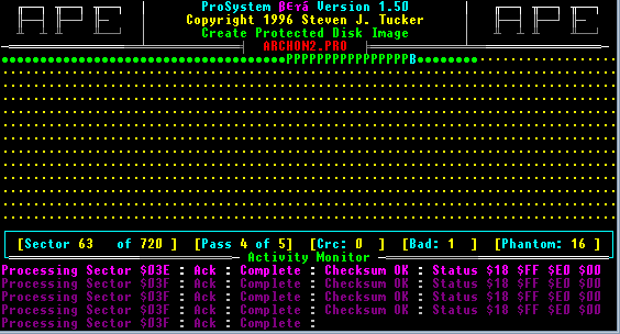 You may have heard the Ape ProSystem talked about as part of APE itself, and as a seperate program, PROSYS.EXE. While this can be confusing, its important to understand that the ProSystem is a combination of both the PROSYS.EXE program itself, and emulation code within APE.The program PROSYS.EXE is does the dog work of the ProSystem. It is used to create the protected and unprotected disk images which are then used by APE.