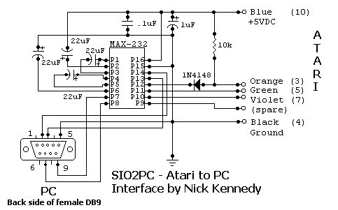 This is the circuit that is used by Nick Kennedy (the devoleper of the SIO2PC software) as seen on his page. It uses a MAX-232 RS232 to TTL level converter and is somewhat more expensive than the 14C89 version below. Either interface will work just fine. I have built all the different interfaces shown on the pages and some not shown. There is little or no performance difference between any of them in normal operation.