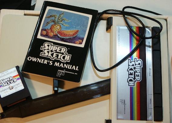 This is a 10" X 14" tablet that lets you slip in a half letter page to trace or freehand a drawing into the computer. Four colors, patterns, fills, custom/grab patterns, save/load, cut/paste, text, brushes, magnify, and tools. I have used this and now prefer it over the Atari/Koala pad software. A convert/gray-scale print utility is on the site.