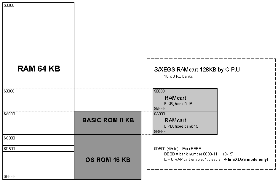 After execute SXEGSD2P.COM, DOS is stored into RAMcart memory and you can start it from the cartridge every time. It has default device D8: and this device uses SXEGS RAMcart memory as 120KB ramdisk (cart battery keeps his content when Atari computer is turned off).