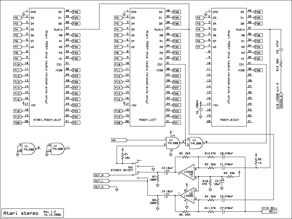 Důležitá upozornění: Pokud si budete vyrábět stereo rozšíření dle následujího schématu a popisu, činíte tak na vlastní nebezpečí! Záměrem autorů bylo vytvořit pokud možno co nejméně invazivní řešení bez nevratných změn v zapojení Atari a bez poškozování chipů Pokey ohýbáním jejich nožiček. (V některých drastických návodech je dokonce zmiňováno uštipování nepoužitých nožiček - to prosím nikdy nedělejte!) Při jakýchkoliv úpravách prosím vždy postupujte opatrně a neničte Atari techniku.