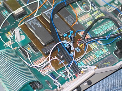 ![]() Celkový pohled na destičku zasunutou do Atari. Trojice černých stíněných vodičů a modrý vodič jsou vedeny k boční straně Atari k přepínači mono/stereo. Dále černá stíněná dvojlinka vede k výstupním cinch konektorům. Další modrý vodič přivádí signál BELL z chipu GTIA. Dva bílé vodiče na protilehlé straně jsou signál A4 a SOUND_R. (Poznámka: Ostatní vodiče a přepínače na boční straně Atari nesouvisí se stereo rozšířením - v tomto Atárku je zabudováno i rozšíření paměti a přepínání OS.) |