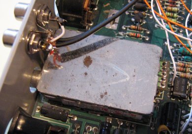 ![]() Konektory cinch pro stereo výstup lze umístit například nad TV modulátor. Vpravo vedle modulátoru je vidět chip U1B (LM358), na jehož pin 6 je přiveden signál SOUND_R ze stereo destičky (bílý drát). (Poznámka: Ostatní bílé a oranžové vodiče v oblasti pravého horního rohu nesouvisí se stereo rozšířením.) |