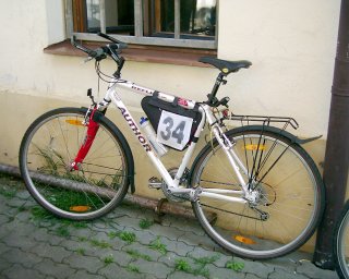 Jdeme se zaregistrovat, podepsat úpis (či co to bylo), fasujeme čísla, špendlíky, mapky, stravenky a trička. Během připevňování čísla na kolo mi poslední ze čtyř zavíracích špendlíků někam zmizel. Nemohl jsem ho nikde najít, což mě hodně znervózňovalo, páč bych ho pak nerad našel zapíchnutý do pláště kola. Ufff, našel jsem ho – a ležel fakt kousek za zadním kolem, rošťák!