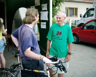 Převlékáme se do dresů, hlavy zabezpečujeme přilbami a chystáme se pomalu přesunout na start. Před oratoří se ke mně ještě hlásí nějaký člověk – dovídám se, že je to Zdeněk Zemánek, který četl na mém webu má povídání o K24 a rozhodl se to taky zkusit, dokonce i s partnerkou (Ajajaj – zas další dva lidé co mě budou v následujících 24 hodinách proklínat ;-))