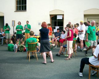 Převlékáme se do civilu, balíme. Stále to vypadá na déšť, takže organizátoři stěhují vše co je voděneodolné pod přístřešky. Vyhlášení bude asi uvnitř v oratoři? Ale kdepak! Sluníčko opět vylezlo, tak zase všechno přestěhovali ven. Závěrečné vyhlášení výsledků tedy proběhlo venku na dvoře před oratoří. Všichni účastníci obdrželi upomínkové diplomy, tři nejlepší ženy a muži byli oceněni medailemi. Žádný rekord prý letos překonán nebyl, ale myslím, že to nevadí a že je daleko důležitější, že to všichni přežili a že jsme mohli opět strávit příjemný čas v přátelské atmosféře nenormálních lidí, kteří jdou dobrovolně mučit svá těla i duše na tento cyklomaraton. :-)