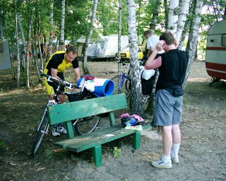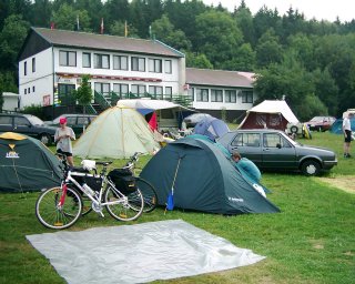 V 17:10 se vracíme zpátky ke vstupu do skal a radostně se shledáváme s našimi koly, která nám, sláva, nikdo neukradl. Závisláci Pavel a Honza ještě před odjezdem exnou u stánku s občerstvením jedno pivko, pak pokračujeme v jízdě pár kilometrů do kempu Jinolice. I tento kemp je celkem plný, ale vyhlédli jsme si pěkný plácek, na kterém jsou Holanďani - teda né že bychom je vyhazovali - to oni už sami začali balit, když nás viděli jak si obhlížíme jejich stanoviště. Počkali jsme tedy než se sbalí a odjedou, a pak si na jejich místě postavili naše stany. Přesněji řečeno, můj stan jsem stavěl sám bez Pavla, protože jak Pavel zahlédl místní vodní hladinu, opřel kolo o nejbližší strom a utíkal se koupat do vody plné bacilů, na což ho (a všechny jemu podobné lachtany), upozorňovala velká cedule "Koupání zakázáno". My jsme koupání v rybníčku Brčálníku oželeli a místo toho sháněli 10Kč mince pro automatický systém ve sprchách, respektive, v tomto případě by se spíš mohlo říct "pro bojovou hru ve sprchách". Funguje to tak, že u vstupních dveří do sprch je velký panel plný různě barevných blikadýlek - standardně svítí 4 červená. Desetikačku vhodíte do otvoru a přístroj rozsvítí místo jedné z červených diod zelenou. Vy pak vlezete dovnitř, kde najdete 4 dveře, a jdete do sprchy s příslušným číslem 1 až 4. Tam se zavřete, svlečete donaha, stisknete čudlík, a doufáte, že jste v té správné sprše. Pořád ale ještě nemáte úplně vyhráno, protože voda je tu opět na příděl a až systém dojde k názoru, že už toho bylo dost, voda téct přestane. Pokud se tedy umýt nestihnete, zůstanete namydlený (a to doslova). Takže jsem se sprchoval jako o závod a náramně si oddychnul, když už jsem ze sebe všechno mýdlo opláchnul a voda ještě tekla. Byl jsem zvědavý, jestli voda po limitu přestane jen tak z ničeho nic, nebo předtím bude něco aspoň výhružně pípat. Takže nový objev - proud vody se nejdřív sám třikrát zastavil a zase pustil, to bylo poslední varování, a minutu poté byl s vodou definitivní utrum.