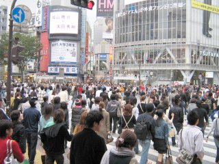 ![]() Křižovatka ve čtvrti Shibuja, zcela zaplněná chodci (všichni chodci mají zelenou a chodí se i úhlopříčně). |