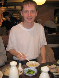 Další pátrání po v průvodci doporučené restauraci Myoko ale úspěšné nebylo, tak jsme vlezli náhodně do jiné, kde jsme si dali opravdu výtečnou večeři – nebo spíš bych měl říct, že to byla hostina. ;-) Bob jedl pečené vepřové kousky a praženou kukuřici, já nudle s opečeným vepřovým masem a zeleninou, a pak ještě velkou rybu (v lístku nebylo poznat že je tak velká). Pepa měl tolik rozmanitých misek s různými dobrotami, že zaplnil celý stůl – přesný výčet už nedám dohromady. K jídlu jsme vyžahli dvě 380ml láhve saké. Fascinovalo mě vědomí, že se nacházíme “na druhém konci světa”, a přitom se tu cítím úplně pohodově. Věta: “Hoši, dochází vám, že si právě žereme a chlastáme v hospůdce v Tokiu?!” tam padla hodněkrát. :-) Zpětně musím říct, že to pro mě byla ta největší a nejlepší večeře za celý pobyt v Japonsku. Po jídle při placení účtu na celkových společných 5900JPY došlo k úsměvnému trapasu. Servírka nám jej položila na stůl a odešla, my jsme k němu položili “miliónovou” bankovku (10000JPY) a čekali, že si to nenápadně odnese, a pak nenápadně vrátí nazpět. Ona ale přišla, usmívala se a něco nám japonsky říkala, čemuž jsme vůbec nerozuměli (anglicky neuměla). Mysleli jsme, že se ptá jestli bylo vše v pořádku, a tak jsme se na ni taky usmívali a souhlasně kývali hlavami. Musela tedy za námi poslat kolegu, který nás u stolu zkasíroval. Až později nám došlo, že nás žádala, abychom účet zaplatili u pokladny, protože u stolů se normálně neplatí. :-) Tak jsme jí aspoň při odchodu poděkovali našim oblíbeným nacvičeným ”gočisósama dešita”, čemuž evidentně porozuměla a radostně se ukláněla a děkovala.