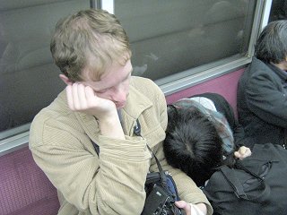Ze Shimbashi jedeme metrem trasou G do stanice Ginza, tam přestupujeme na naši domácí trasu Hibiya. Vedle Pepy seděla nějaká velmi unavená japonská dívčina, a jak spala, postupně se opírala Pepovi o rameno a pomalu se mu sesouvala do náruče. Naštěstí se ale pak na své stanici sama vzbudila a vystoupila, takže jsme nemuseli řešit, jak z pod ní Pepu vyprostit. :-)