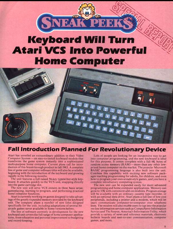 In 1983, four companies proposed to turn the Atari 2600 into a real home computer. However, Atari's My First Computer [second picture from Matt Brady], Entex's Piggyback, Unitronics's Expander, and Spectravideo's Compumate were deficient in some way (capabilities, keyboard, price, etc) and couldn't stand up against the existing home computer market.