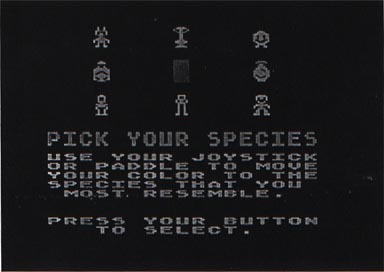 After choosing a color, you will select your character. Point the joystick towards a character, and it will appear in the center of the screen. Push your joystick button to choose it. If you don't want this one, move another character into the center of the screen, and push the joystick button. When you are done, the computer will cycle through the remaining colors for the other players.