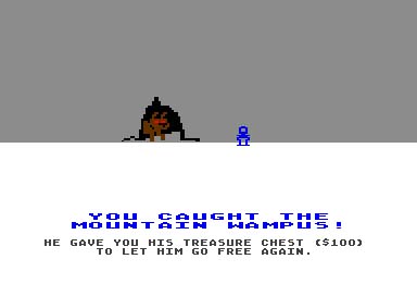 The Wampus lives in caves in the mountains. When he opens his door, his bell rings and a light flashes. If you catch him, he will pay you to let him go.
