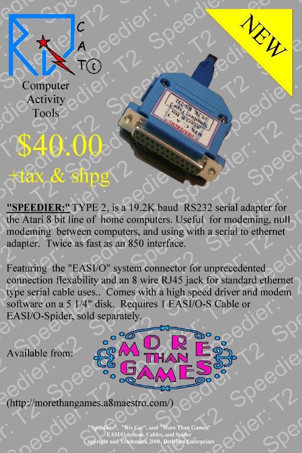 More Details: Finally a plug in solution to slow rs232 devices. SPEEDIER: maxes at a blazing 19.2K baud. Thats about 1900 characters a second. Great time saver for all networking and modeming needs. Since this is an EASI/O device, it has DB25 connectors on one end, has an RJ45 ethernet style jack on the other, and requires an EASI/O-S cable, 18" or 36", or the NEW EASI/O SPIDER. Comes with driver software on 5 1/4" floppy. Tested and works with Bobterm(1.21), Flickerterm(.33), and Ice-T(v=?). See Type 1 here ADVERT ![]() I was using this with a switchbox for null modeming and sio2pc, over 100ft to my ST in another room. Now that they are 4 ft apart, I do not use the switch. But, to use the regular speedier: with small ethernet type cable, I need the speedier: and a db25 to rj45 adapter minimum. If I want to use the rs232 tester, then I need that and a standard gender changer(a slimline flips things upside down). Using Type 2 makes it 1/3 the length. Still requires an EASI/O cable or SPIDER for the Atari side. |