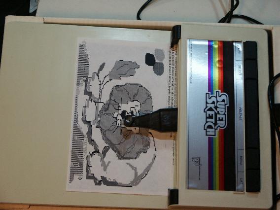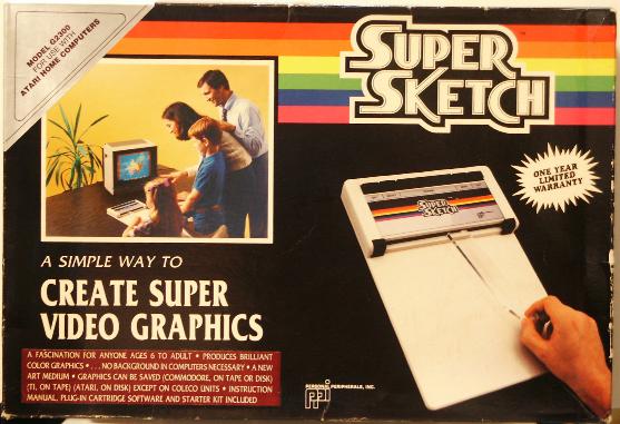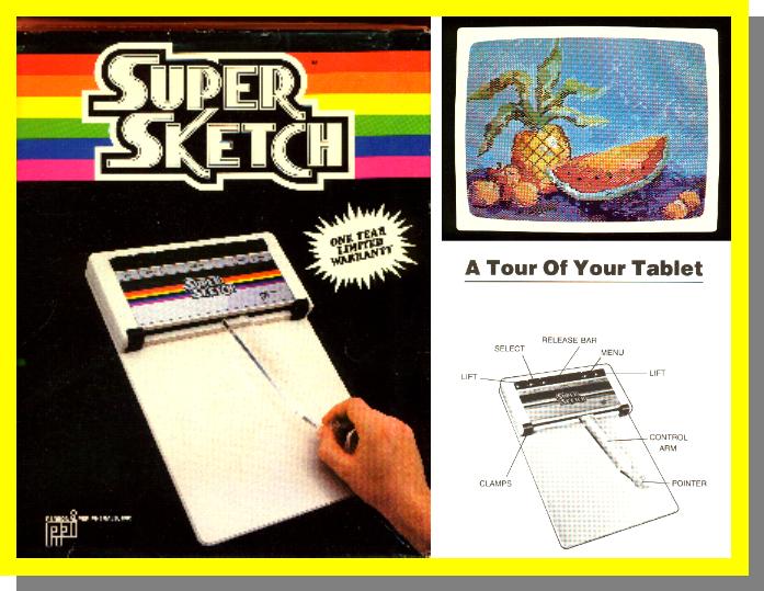 This is a 10" X 14" tablet that lets you slip in a half letter page to trace or freehand a drawing into the computer. Four colors, patterns, fills, custom/grab patterns, save/load, cut/paste, text, brushes, magnify, and tools. I have used this and now prefer it over the Atari/Koala pad software. A convert/gray-scale print utility is on the site.