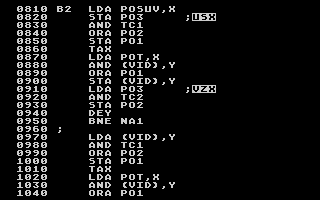 Postupem času jsem začal k BASICu přidávat podprogramy ve strojovém kódu. Říkám schválně strojový kód a ne Assembler, protože jsem žádný překladač neměl. Nejdříve jsem si napsal podprográmek na papír, podle tabulek ručně přeložil do strojového kódu, a pak přepsal do DATA řádků a spouštěl. Během odlaďování každého takového podprogramu jsem zažil desítky totálních "zatuhnutí" počítače.