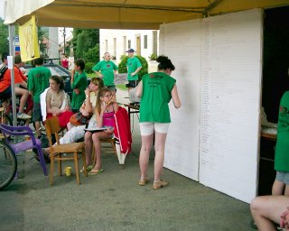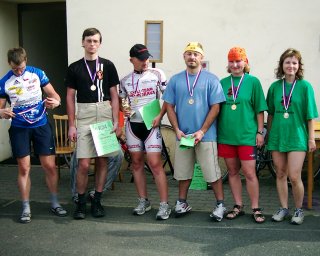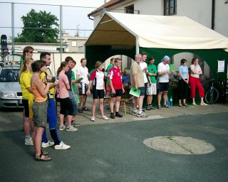 Převlékáme se do civilu, balíme. Stále to vypadá na déšť, takže organizátoři stěhují vše co je voděneodolné pod přístřešky. Vyhlášení bude asi uvnitř v oratoři? Ale kdepak! Sluníčko opět vylezlo, tak zase všechno přestěhovali ven. Závěrečné vyhlášení výsledků tedy proběhlo venku na dvoře před oratoří. Všichni účastníci obdrželi upomínkové diplomy, tři nejlepší ženy a muži byli oceněni medailemi. Žádný rekord prý letos překonán nebyl, ale myslím, že to nevadí a že je daleko důležitější, že to všichni přežili a že jsme mohli opět strávit příjemný čas v přátelské atmosféře nenormálních lidí, kteří jdou dobrovolně mučit svá těla i duše na tento cyklomaraton. :-)