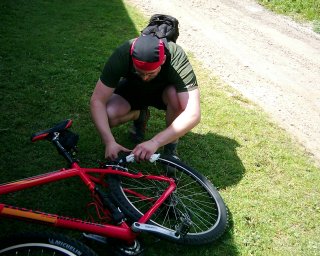 V Protivanově jsme udělali další technickou zastávku s válečnou poradou. Shrňme si fakta: čtvrtina cesty za námi, hnusný studený protivítr, Mojmírovi není zrovna dvakrát dobře od žaludku a navíc je mu kosa, protože si nevzal bundošku. Ani mě nemusí nijak přemlouvat - je to jasné, otáčíme. Abychom nejeli úplně stejnou cestou zpět, odbočujeme na Repechy, kde Mojmír vyžebral od kamarádových rodičů flašku s technickým benzínem, že si aspoň odmastí ten ráfek, když to teď bude prudce z kopce. Cesta lesem vedla sice převážně po pěkné asfaltce, ale neustálé bombardování obličeje broučkama a smetím ze stromů mě teda vážně nenadchlo. Už mě tam příště nikdo nedostane, teda aspoň žádnej chlap ne (kdyby mě chtěla do lesa zatáhnout ženská, to bych ještě uvážil ;-)).