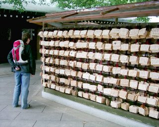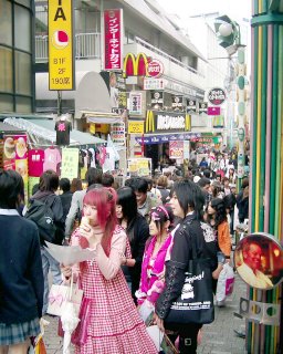 V uličce Takeshita-dori jsme potkávali davy vyparáděných teenagerů, přesně jak se psalo v průvodci. Vypadá to, že se zdejší mládež trumfuje, kdo se "ohánkne do uhozenějšího vohozu" - čím strakatější barvy, kostkovanější či pruhovanější vzory, víc stuh, kraječek, mašliček, tím líp. Samozřejmostí jsou divoké účesy, různobarevné vlasy a piercing kde vás jen napadne. :-)