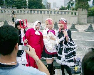 ![]() Děvčata pózující pro turisty na mostě poblíž jihovýchodního vstupu do parku Yoyogi-koen. |