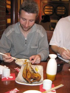 Další pátrání po v průvodci doporučené restauraci Myoko ale úspěšné nebylo, tak jsme vlezli náhodně do jiné, kde jsme si dali opravdu výtečnou večeři – nebo spíš bych měl říct, že to byla hostina. ;-) Bob jedl pečené vepřové kousky a praženou kukuřici, já nudle s opečeným vepřovým masem a zeleninou, a pak ještě velkou rybu (v lístku nebylo poznat že je tak velká). Pepa měl tolik rozmanitých misek s různými dobrotami, že zaplnil celý stůl – přesný výčet už nedám dohromady. K jídlu jsme vyžahli dvě 380ml láhve saké. Fascinovalo mě vědomí, že se nacházíme “na druhém konci světa”, a přitom se tu cítím úplně pohodově. Věta: “Hoši, dochází vám, že si právě žereme a chlastáme v hospůdce v Tokiu?!” tam padla hodněkrát. :-) Zpětně musím říct, že to pro mě byla ta největší a nejlepší večeře za celý pobyt v Japonsku. Po jídle při placení účtu na celkových společných 5900JPY došlo k úsměvnému trapasu. Servírka nám jej položila na stůl a odešla, my jsme k němu položili “miliónovou” bankovku (10000JPY) a čekali, že si to nenápadně odnese, a pak nenápadně vrátí nazpět. Ona ale přišla, usmívala se a něco nám japonsky říkala, čemuž jsme vůbec nerozuměli (anglicky neuměla). Mysleli jsme, že se ptá jestli bylo vše v pořádku, a tak jsme se na ni taky usmívali a souhlasně kývali hlavami. Musela tedy za námi poslat kolegu, který nás u stolu zkasíroval. Až později nám došlo, že nás žádala, abychom účet zaplatili u pokladny, protože u stolů se normálně neplatí. :-) Tak jsme jí aspoň při odchodu poděkovali našim oblíbeným nacvičeným ”gočisósama dešita”, čemuž evidentně porozuměla a radostně se ukláněla a děkovala.