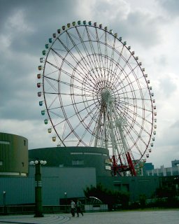 Na ostrově Odaiba se nachází několik opravdu futuristických budov, takže jsme ho téměř celý pěšky prochodili a navštívili třeba expozici firmy Panasonic nebo Národní muzeum nové vědy a inovace. Uvnitř to sice bylo trošku poslabší, ale aspoň jsme dostali slevu 100JPY ze vstupného 500JPY za předložení Tokyo Handy Guide, co jsme vyfasovali předevčírem v budově úřadu tokijské metropolitní vlády ;-). Hlavně mě mrzelo, že se akční předváděčka robota Asimo koná jen jednou dopoledne a jednou popoledni, což jsme už dávno propásli - fakt škoda, to bych moc rád zhlédnul na vlastní oči. Pak jsme se šli podívat šíleně daleko k lázním Oedo Onsen Monogatari, protože Pepa na tom zarputile trval. Navíc pořád vedl řeči, jako by se tam snad chtěl i rochnit, ale já a Bob jsme nejevili zájem, takže to zašel dovnitř jen na moment omrknout. To už se stmívalo a my pak šli zase tu šílenou dálku zpátky a bolela nás pekelně chodidla. Večeřeli jsme misku masa s rýží (540JPY) v jednom z restauračních podniků poblíž nákupního centra Deck’s. Večer jsme chvíli postáli na pobřeží, ve vodě se odrážela světla mrakodrapů a nasvětlený Rainbow Bridge – prostě krása! Samozřejmě jsme nemohli vynechat zhlédnutí místní sochy Svobody, která je sice vysoká jen asi 10 metrů, ale taky pěkná. Poté jsme zašli do Palette Town do expozice aut a úplně nakonec si koupili lístky za 900JPY a počkali si zhruba dvacet minut ve frontě na celoskleněnou gondolu obřího osvětleného ruského kola (postaveno v roce 1999 - tehdy bylo největší na světě). Jedna otáčka trvala asi 12 minut a v nejvyšším bodě jsme byli ve výšce odpovídající druhému vyhlídkovému patru pařížské Eiffelovky, to jest 115 metrů.